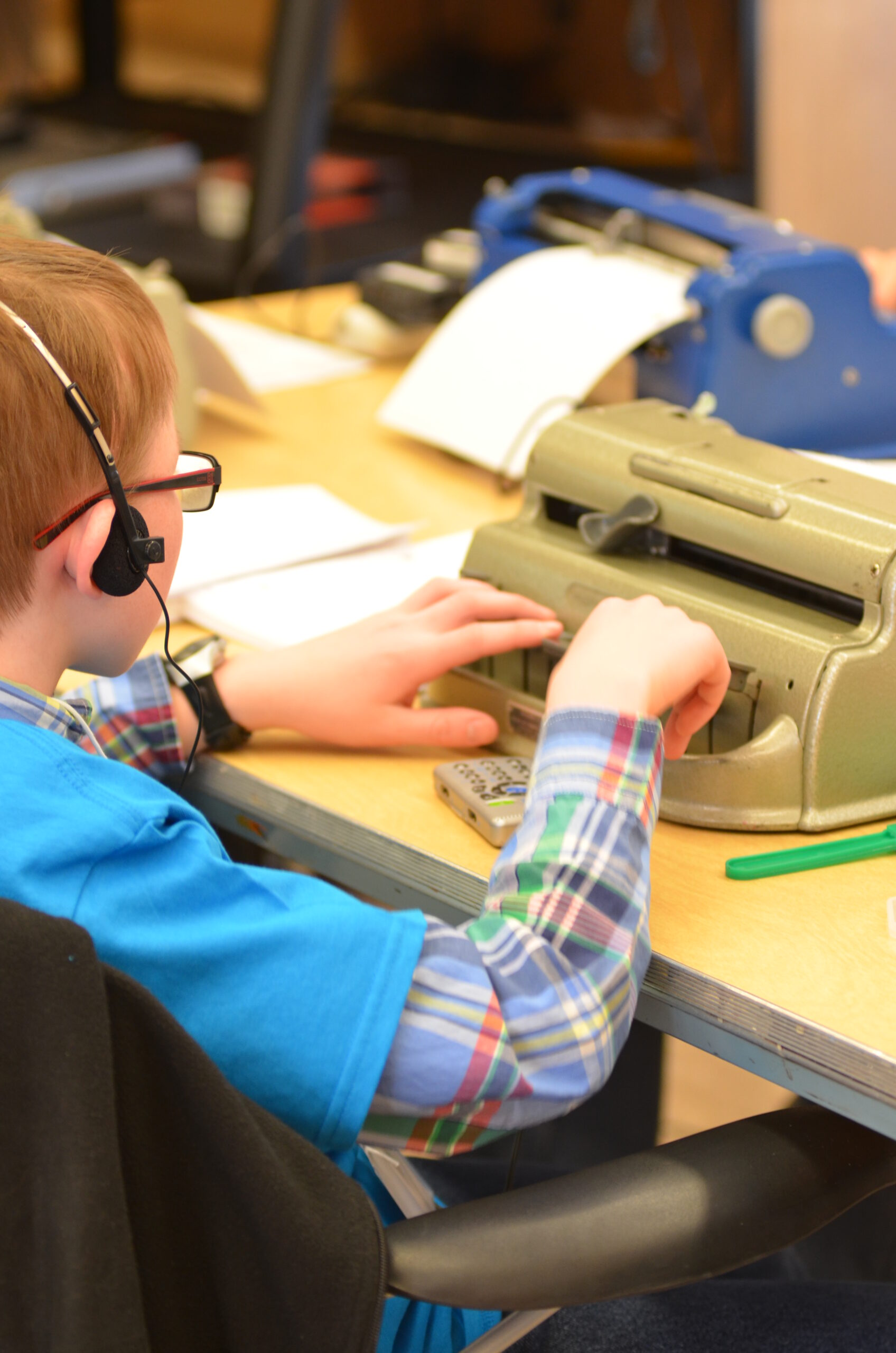 The Kentucky School for the Blind Charitable Foundation plays a significant role in putting braille writers into the hands of visually impaired students and adults. A braille writer is a device (similar in concept to a typewriter) that allows students to produce braille. Rather than printing ink, braille writers emboss raised braille dots on special heavyweight paper.